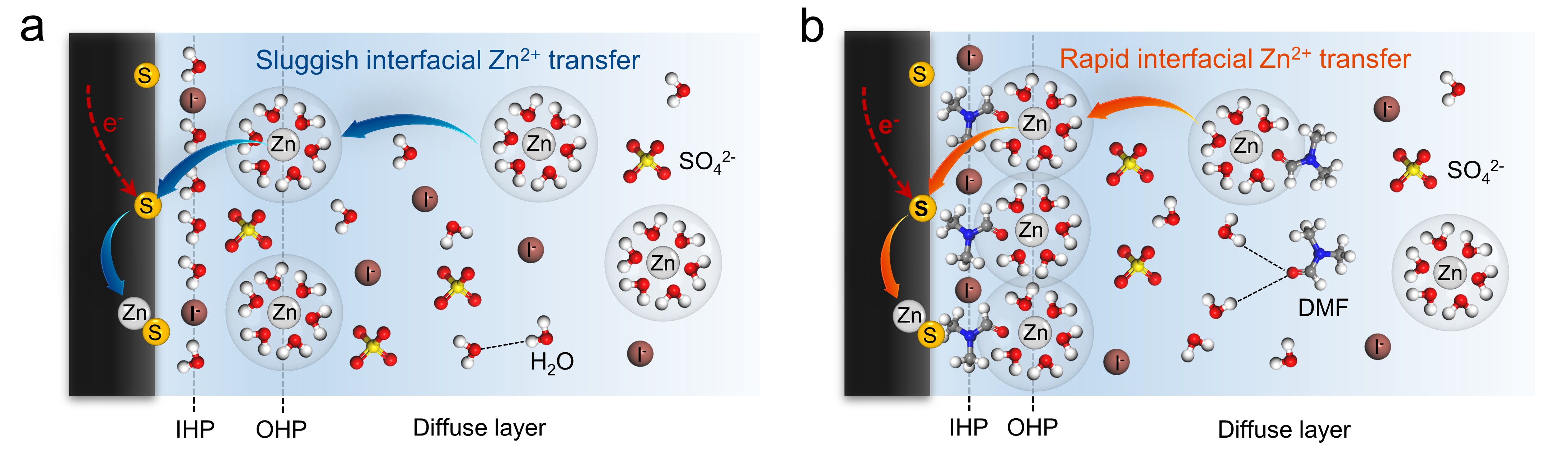 发生在硫电极/电解质界面的双电层(EDL)在硫转化反应过程中的电荷转移和离子传输过程中起着关键作用。通常,当硫电极与水性电解质接触时,吸附的阴离子和水分子位于内亥姆霍兹平面(IHP),溶剂化的Zn²⁺位于外亥姆霍兹平面(OHP)。在锌硫电池中,硫还原反应将涉及Zn²⁺从OHP转移到硫电极表面,同时伴随着电子从电极转移到硫纳米颗粒以实现相转化为ZnS。由于界面润湿性差,EDL区域内的Zn²⁺传输/转移将主导阴极硫还原反应的动力学。因此,调控界面EDL结构和Zn²⁺排列方式为促进硫转化提供了内在的设计原则。