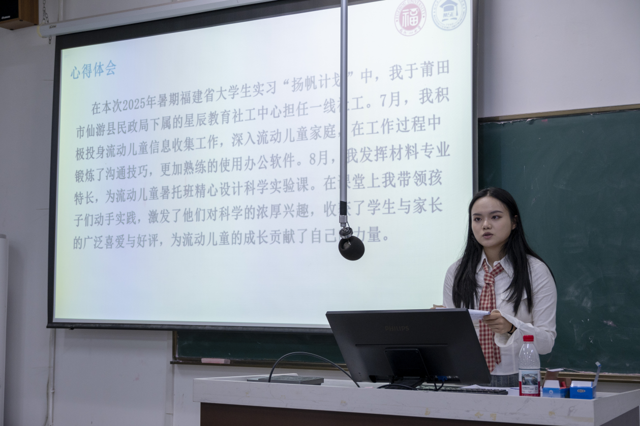 随后,朱辰卉同学分享了她在仙游县星辰教育社工中心的实习故事。从细致核实全县流动儿童信息,到为暑托班的孩子们带去妙趣横生的科学课程,她在实践中锤炼了实务能力,更在奉献中收获了深刻的成长体悟。“‘扬帆计划’于我而言,不只是一个实践平台,更是一次认识自我、联结社会的宝贵契机。” 她这番真挚的分享,让同学们对“扬帆计划”的意义有了更真切的共鸣。