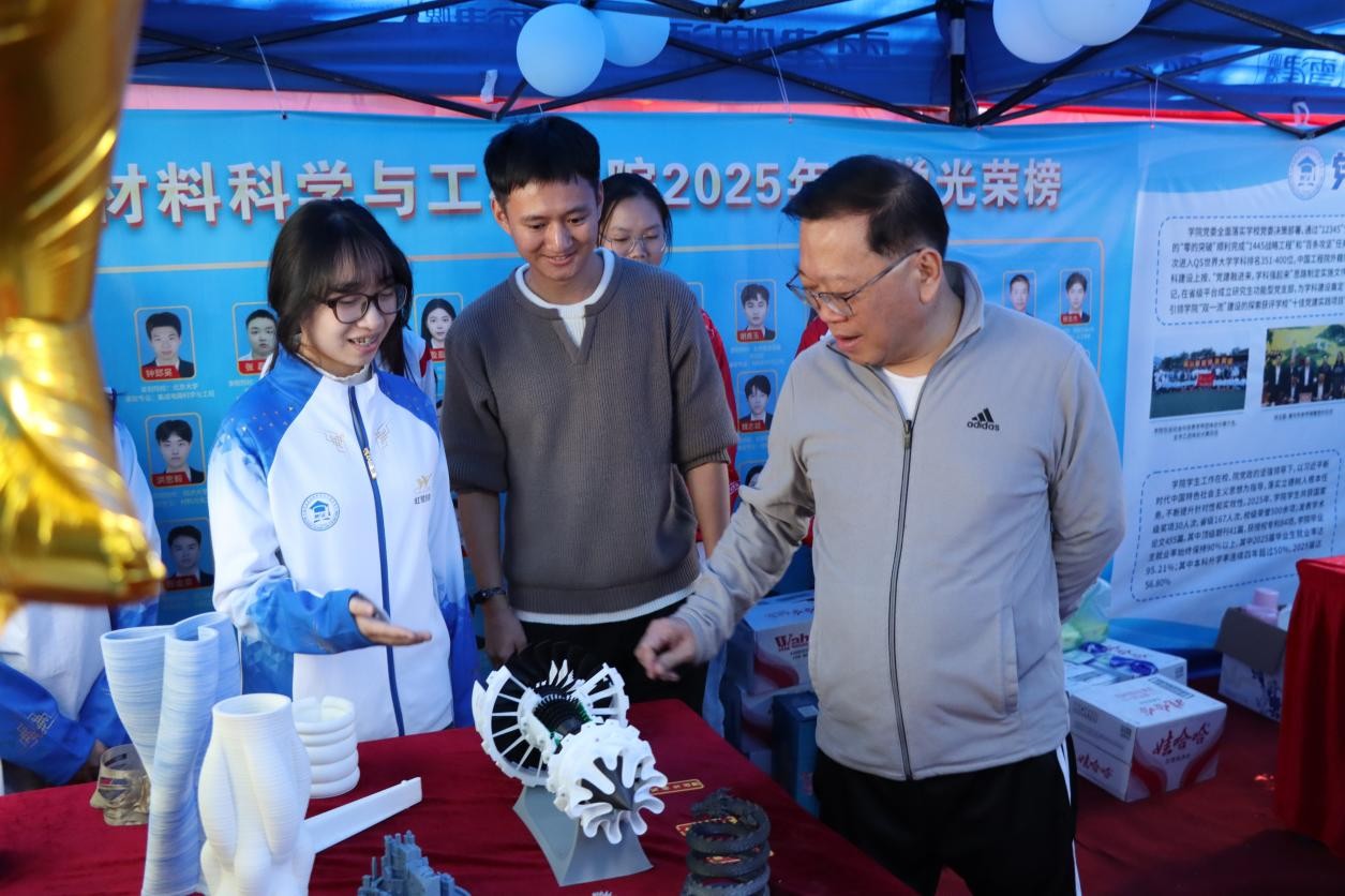 校党委陈国龙书记莅临材料学院运动会大本营,实地察看赛事组织情况。在大本营,陈国龙书记仔细询问赛事筹备、师生参与度等细节,与工作人员亲切交流并肯定大家的付出。途中,陈国龙书记驻足材料学院3D打印成果展示区,听取技术原理与学生创新实践介绍,对专业知识与校园活动的结合给予高度评价。领导们的关怀与嘱托,让全体师生备受鼓舞,处处激荡着奋勇拼搏、团结向上的澎湃激情。