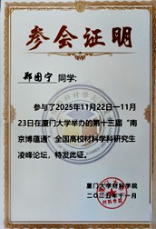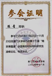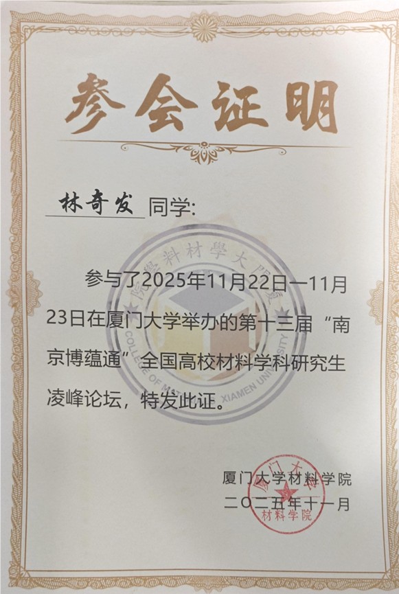 2025年11月21-23日,由厦门大学研究生院、厦门大学材料学院及南京博蕴通仪器科技有限公司联合举办的第十三届“南京博蕴通”全国高校材料学科研究生凌峰论坛在厦门大学举行。本届论坛以“弘扬嘉庚创新精神,勇攀南强科学凌峰”为主题,旨在为研究生提供一个交流分享的平台,深化其对材料科学的理解,并推动其探索新的研究方向。福州大学材料学院2023级博士研究生陈青、2023级硕士研究生林奇发、2024级硕士研究生郑图宁受邀参加本次论坛,与各高校的研究生代表们以学术汇报形式展开学术交流。
