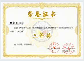 我院研究生代表陈青、林奇发、郑图宁同学分别于凌峰论坛作了以《定制同步电荷隧穿光系统用于太阳能CO2转化》、《局部极化无序工程实现KNN基陶瓷透明性和压电性的同步增强》及《通过功能性隔膜设计在碳酸脂电解液中构筑稳定的富硝酸盐溶剂化鞘层实现高压锂金属电池》为主题的学术汇报。其中,林奇发同学凭借出色的汇报表现,荣获第十三届“南京博蕴通”全国高校材料学科研究生凌峰论坛“口头汇报三等奖”,充分展现了福大材子的优秀风采。