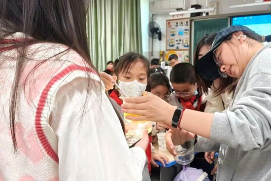 接着,“牛奶烟花”实验精彩亮相。成员先将配制好的盐水缓缓倒入清水,再用滴管吸取混有色素的牛奶,将其轻轻滴入水中——霎时间,色彩如烟花般绽开,在液面下扩散、交织,形成绚丽变幻的图案。结合这生动的一幕,成员为孩子们讲解了液体密度差异与分子扩散的原理,并邀请他们亲手尝试。在视觉震撼与动手体验中,抽象的科学知识变得直观可感,孩子们也真切领略到科学的魅力。
