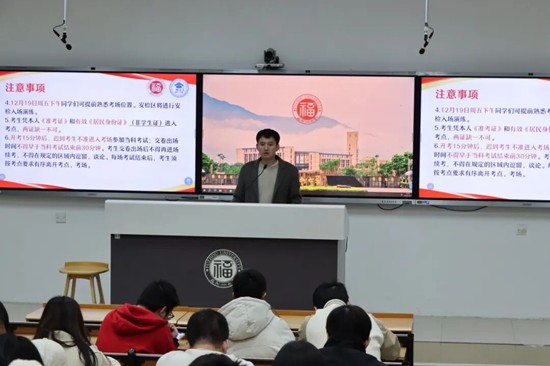 动员会上,张庭士老师详细介绍了考试相关安排。他提醒同学们,教学楼将于12月19日18:00起封闭,须提前带走个人物品。考点入口位于西三教学楼南侧停车场,建议考生于上午7:40、下午13:10前抵达并配合安检,入场时须同时出示《准考证》和有效居民身份证。考试期间须严格遵守纪律,不携带违规电子设备,不涂改答题卡,不将试卷带离考场。此外,12月19日下午可前往考场熟悉环境并参加安检演练。