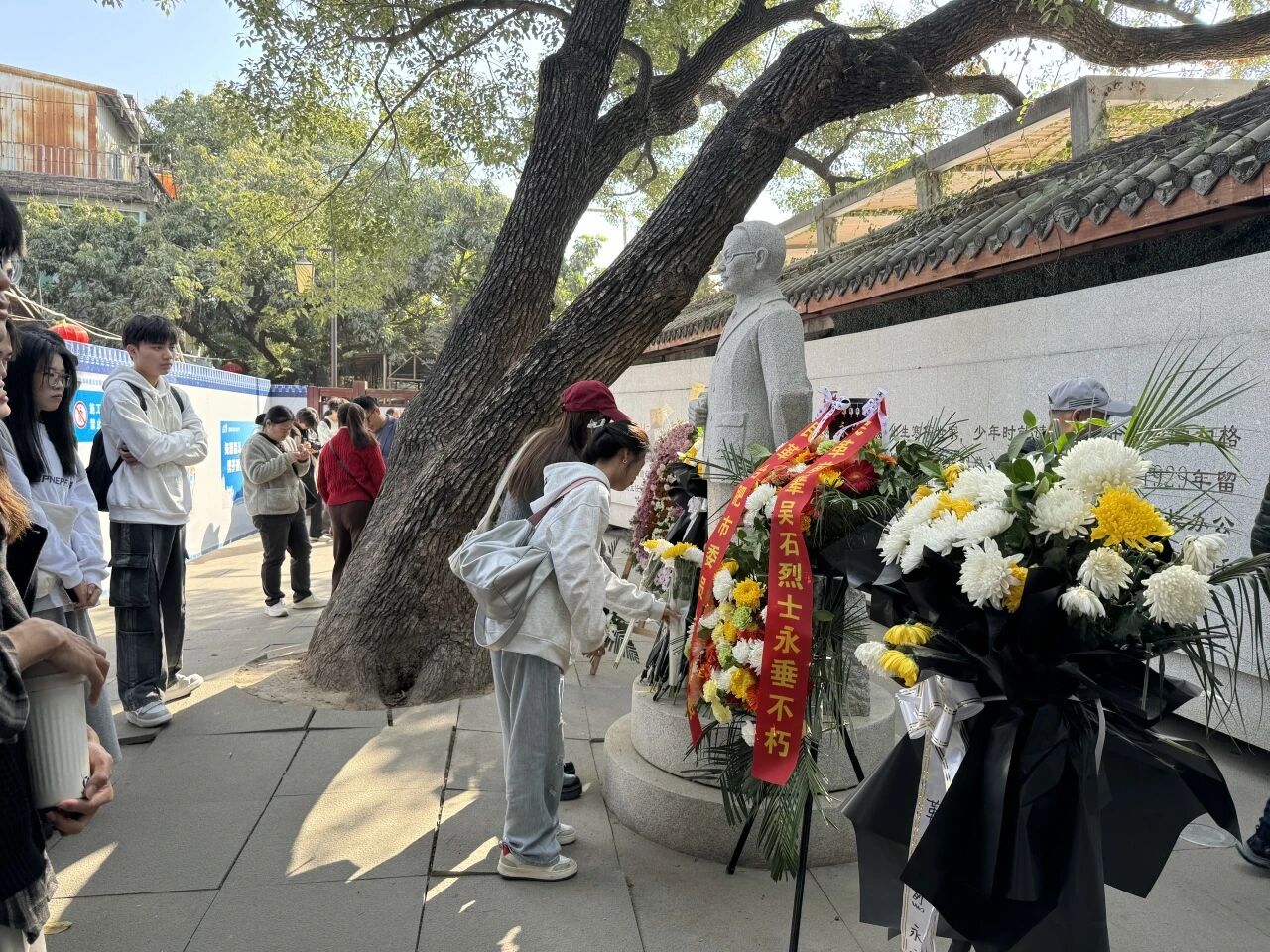 随后,同学代表缓步上前,将素雅的鲜花摆放在雕像基座前。鲜花寄托着哀思,每一个鞠躬饱含着对革命先烈的崇敬。在工作人员的讲解下,同学们认真聆听吴石将军的生平事迹:他曾投身北伐战火,也曾潜伏台湾坚持隐蔽斗争。他始终恪守“毋为臣不忠”的祖训,面对威逼利诱时更是铁骨铮铮。吴石将军的赤诚气节,令在场同学深受触动。