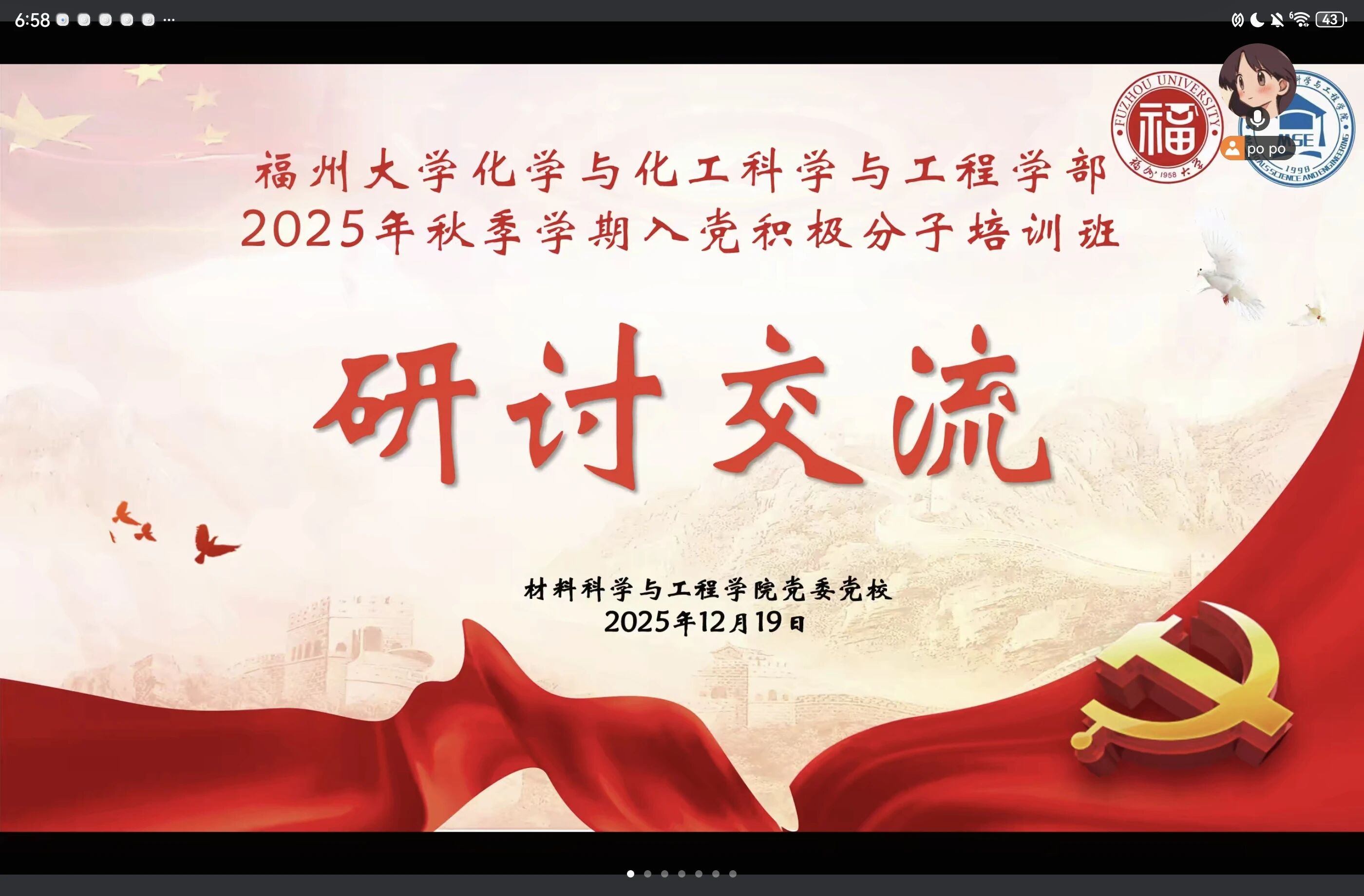 为深入学习贯彻《中国共产党章程》,12月19日晚,材料学院党委党校组织2025年秋季入党积极分子培训班学员,开展以“如何在学习、工作和生活中发挥先锋模范作用”为主题的线上研讨活动。研讨过程中,学员们凝聚共识、踊跃发言,一致表示要在学习上深耕专业知识、积极投身科研实践;在工作中秉持担当精神、竭诚服务同学;在生活中恪守纪律、践行团结互助之风。此次研讨进一步强化了学员的先锋模范意识,为其今后以党员标准严格要求自己、主动向党组织靠拢筑牢了思想基础。