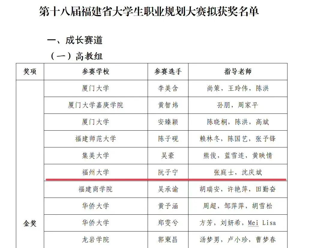 本次大赛以“筑梦青春志在四方,规划启航职引未来”为主题,汇聚福建省各高校众多优秀学子同台竞技,赛事规格高、竞争激烈。备赛过程中,阮子宁同学在沈庆斌、张庭士两位老师的悉心指导与全程陪伴下,结合材料专业特色,立足自身成长与职业发展,精心打磨规划方案,在比赛中展现出她清晰的职业认知、坚定的理想信念与过硬的综合能力,充分彰显了材料学子的青春风采与专业实力。